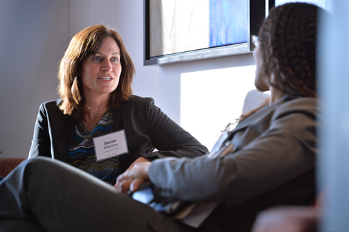 PLC Staff Attorney Sarah Efthymiou consults with Eve Runyon of Corporate Pro Bono